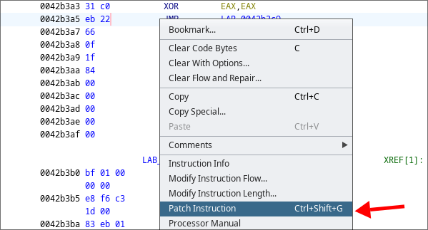 在0x42b3a5 那一行按右键 Patch Instruction 或者快捷键 Ctrl + Shift + G
