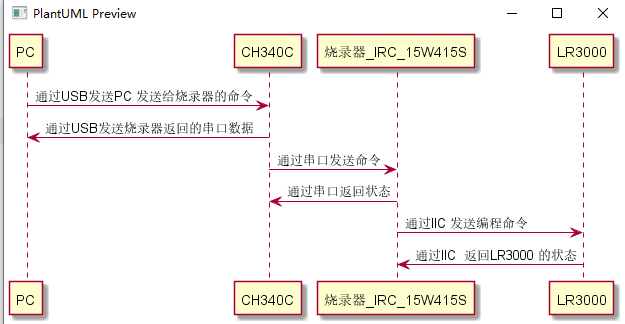 OTP-MCU LR3000 简介 接口说明 烧录器架构 1 2 3 4 5 6 7 8 @startuml PC -> CH340C: 通过USB发送PC 发送给烧录器的命令 CH340C -> PC: 通过USB发送烧录器返回的串口数据 CH340C -> 烧录器_IRC_15W415S: 通过串口发送命令 烧录器_IRC_15W415S -> CH340C: 通过串口返回状态 烧录器_IRC_15W415S -> LR3000: 通过IIC 发送编程命令 LR3000 -> 烧录器_IRC_15W415S: 通过IIC 返回LR3000 的状态 @enduml SRAM 芯片与烧录器连接 注意: 拔码开关只需要打开SDA 和 SCL 即可