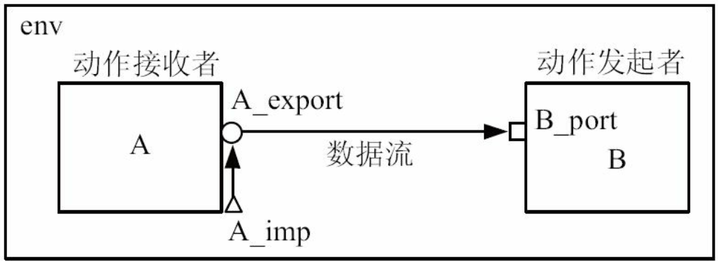 A具有的端口( 用方框表示) 称为PORT, 而B的端口( 用圆圈表示) 称为EXPORT。 这个过程中, 数据流是从A流向B的